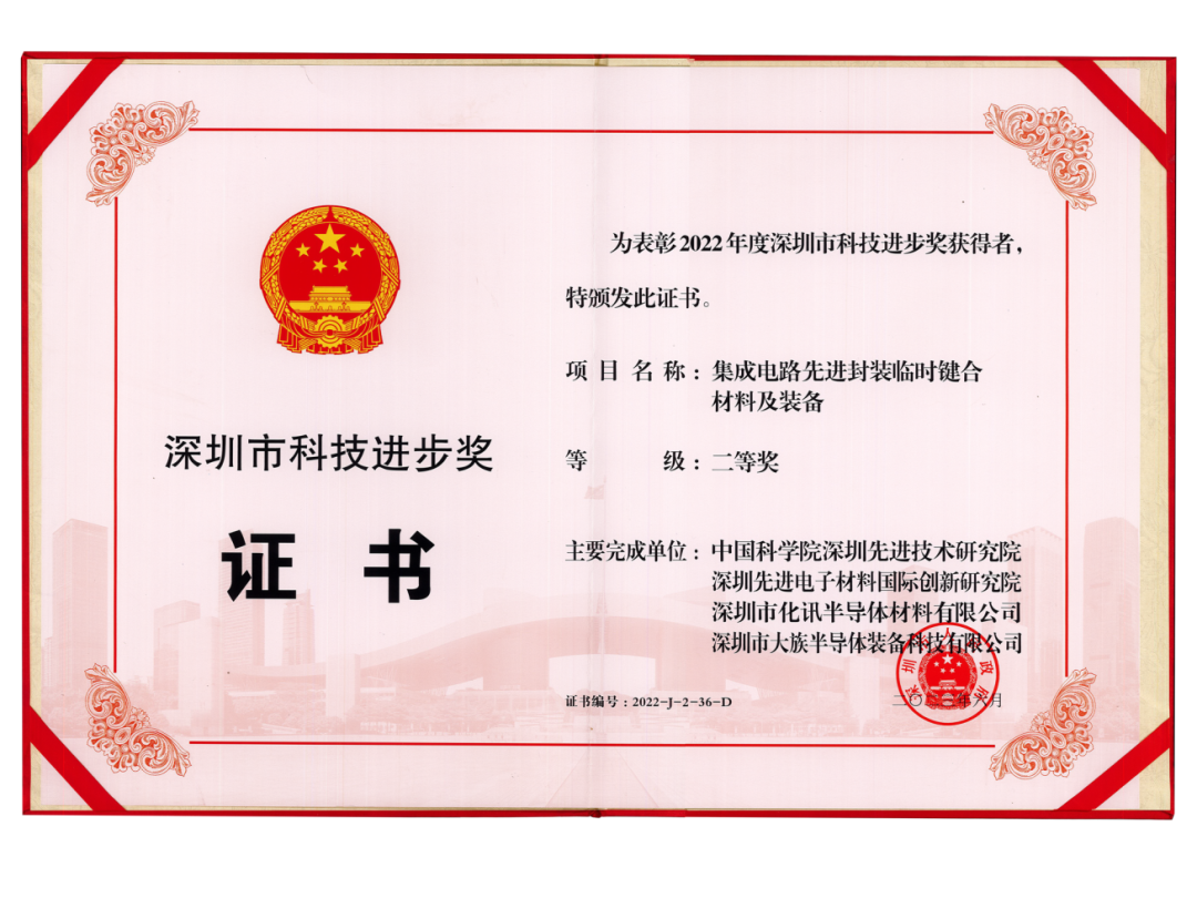 2023年6月,由深圳市大族半導體裝備科技有限公司、中國科學院深圳先進技術研究院、深圳先進電子材料國際創新研究院、深圳市化訊半導體材料有限公司共同申報的“集成電路先進封裝臨時鍵合材料及裝備”項目,榮獲2022年度“深圳市科技進步獎”二等獎。